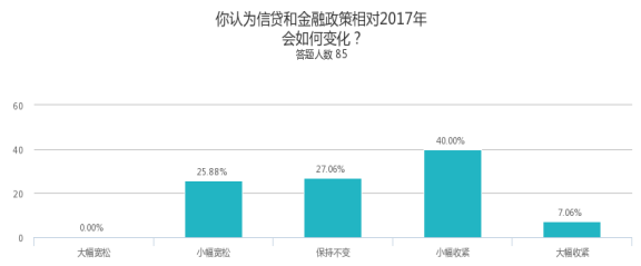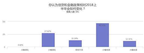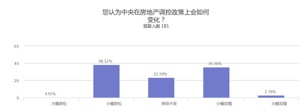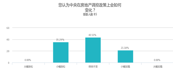 调查结果显示,被调查对象普遍预国家级政策导向的变化幅度不大,对政策的稳定性有较强的预期。但预判小幅放松与小幅加强的比例高于保持不变的。说明判断上出现一定的分化。