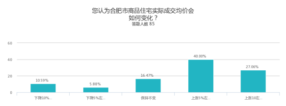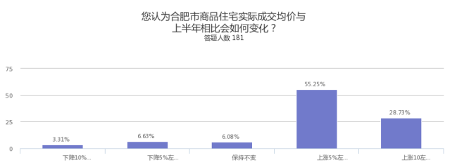83.98%的受访者预期合肥房价会进一步上涨,其中认为会小幅上涨的占比为55.25%,认为会较大幅上涨的占28.73%。此项数据相比年初调查有明显提升。