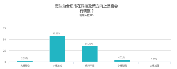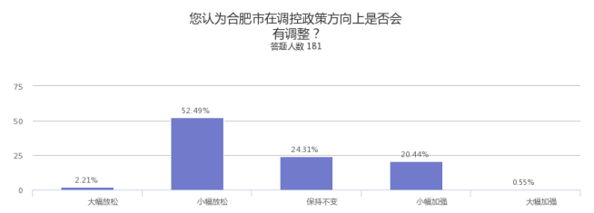 大多数被调查人的观点认为合肥市会在调控政策上有所放松,而其中有52.49%的被调查者意见集中在小幅放松上。但也有4个样本预计合肥会大幅放松调控政策,还有1个样本预计会大幅加强。